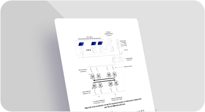 6MW grid connection and grid Solar system tie inverter Distributed along length, 285MW peak power total Energy storage E = 36 MWhr P = 37MW CONT P = 52MW PEAK HVDC bus Traction inverters 65MVA each Linear motors for Solid-state switches arrival track M M M M M M M M Linear motors for departure track Low speed (300mph) end High speed (700mph) end Traction power = 20MW Traction power = 46MW Figure 22. Linear accelerator concept for capsule acceleration and deceleration between 300 and 760 mph (480 and 1,220 kph). 4.3.1. Capsule Components (Rotor) The rotor of the linear accelerators is very simple – an aluminum blade 49 ft (15 m) long, 1.5 ft (0.45 m) tall, and 2 in. (50 mm) thick. Current flows mainly in the outer 0.4 in. (10 mm) of this blade, allowing it to be hollow to decrease weight and cost. The gap between the rotor and the stator is 0.8 in. (20 mm) on each side. A combination of the capsule control system and electromagnetic centering forces allows the capsule to safely enter, stay within, and exit such a precise gap.