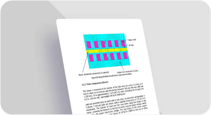Copper coils Air gap Rotor aluminum (mounted to capsule) Stator iron (mounted to tube) Figure 23. Magnetic field strength inside linear induction motor 4.3.2. Tube Components (Stator) The stator is mounted to the bottom of the tube over the entire 2.5 miles (4.0 km) it takes to accelerate and decelerate between 300 and 760 mph (480 and 1,220 km). It is approximately 1.6 ft (0.5 m) wide (including the air gap) and 4.0 in. (10 cm) tall, and weighs 530 lb/ft (800 kg/m). Laid out symmetrically on each side of the rotor, its electrical configuration is 3-phase, 1 slot per pole per phase, with a variable linear pitch (1.3 ft or 0.4 m maximum). The number of turns per slot also varies along the length of the stator, allowing the inverter to operate at nearly constant phase voltage, which simplifies the power electronics design. The two halves of the stator require bracing to resist the magnetic forces of 20 lbf/ft (300N/m) that try to bring them together.