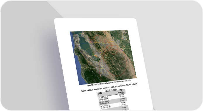 Figure 31. I-580/San Francisco Bay Section of proposed Hyperloop route. Table 6. I-580/San Francisco Bay Section data at 300, 555, and 760 mph (480, 890, and 1,120 Criteria kph, respectively). 0.5g Acceleration Min. bend radius at 2.28 miles 300 mph (480 kph) (3.67 km) Min. bend radius at 7.80 miles 555 mph (890 kph) (12.55 km) Min. bend radius at 14.6 miles 760 mph (1,220 kph) (23.5 km) Distance 73.9 miles (119 km) Journey time 626.0 seconds Tunnel distance 3.5 miles (5.6 km) No. of 20 ft (6 m) 2,783 pylons No. of 50 ft (15 m) 775 pylons No. of 100 ft (30 m) 159 pylons Additional length 5.7 miles required (9.2 km)
