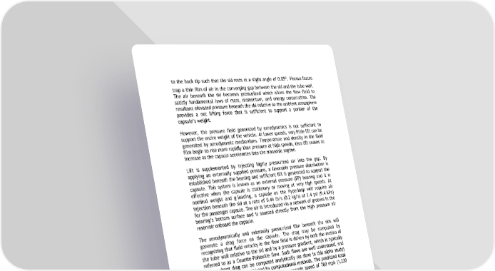 to the back tip such that the ski rests at a slight angle of 0.05º. Viscous forces trap a thin film of air in the converging gap between the ski and the tube wall. The air beneath the ski becomes pressurized which alters the flow field to satisfy fundamental laws of mass, momentum, and energy conservation. The resultant elevated pressure beneath the ski relative to the ambient atmosphere provides a net lifting force that is sufficient to support a portion of the capsule’s weight. However, the pressure field generated by aerodynamics is not sufficient to support the entire weight of the vehicle. At lower speeds, very little lift can be generated by aerodynamic mechanisms. Temperature and density in the fluid film begin to rise more rapidly than pressure at high speeds, thus lift ceases to increase as the capsule accelerates into the transonic regime. Lift is supplemented by injecting highly pressurized air into the gap. By applying an externally supplied pressure, a favorable pressure distribution is established beneath the bearing and sufficient lift is generated to support the capsule. This system is known as an external pressure (EP) bearing and it is effective when the capsule is stationary or moving at very high speeds. At nominal weight and g-loading, a capsule on the Hyperloop will require air injection beneath the ski at a rate of 0.44 lb/s (0.2 kg/s) at 1.4 psi (9.4 kPa) for the passenger capsule. The air is introduced via a network of grooves in the bearing’s bottom surface and is sourced directly from the high pressure air reservoir onboard the capsule. The aerodynamically and externally pressurized film beneath the skis will generate a drag force on the capsule. The drag may be computed by recognizing that fluid velocity in the flow field is driven by both the motion of the tube wall relative to the ski and by a pressure gradient, which is typically referred to as a Couette-Poiseuille flow. Such flows are well understood, and the resultant drag can be computed analytically (as done in this alpha study) and improved and/or validated by computational methods. The predicted total drag generated by the 28 air bearings at a capsule speed of 760 mph (1,220 kph) is 31 lbf (140 N), resulting in a 64 hp (48 kW) power loss. The passenger capsule air bearing system weight is expected to be about 6,200 lb (2,800 kg) including the compressors, air tank, plumbing, suspension, and bearing surfaces. The overall cost of the air bearing components is targeted to be no more than $475,000. Hyperloop Passenger Plus Vehicle Capsule The passenger plus vehicle version of the Hyperloop capsule places more aggressive lifting requirements on the air bearings, but the expanded diameter of the tube provides a greater surface area for lift generation. For this version, an extra 12 in. (30 cm) of width would be added to each bearing. The nominal