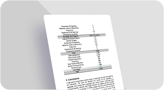 Compressor & Plumbing 6 Batteries, Motor & Electronics 4 Propulsion 3 Suspension & Air Bearings 5.3 Components Assembly 3 Passenger Only Capsule 40.5 (30 capsules) Capsule Structure & Doors 7.4 Interior & Seats 7.6 Compressor & Plumbing 8.2 Batteries, Motor & Electronics 4.5 Propulsion 3.8 Suspension & Air Bearings 6 Components Assembly 3 Tube 7,000 Tube Construction 1,200 Pylon Construction 3,150 Tunnel Construction 700 Propulsion 200 Solar Panels & Batteries 490 Station & Vacuum Pumps 260 Permits & Land 1,000 Cost Margin 429 Total 7,500 6. Conclusions A high speed transportation system known as Hyperloop has been developed in this document. The work has detailed two version of the Hyperloop: a passenger only version and a passenger plus vehicle version. Hyperloop could transport people, vehicles, and freight between Los Angeles and San Francisco in 35 minutes. Transporting 7.4 million people each way and amortizing the cost of $6 billion over 20 years gives a ticket price of $20 for a one-way trip for the passenger version of Hyperloop. The passenger plus vehicle version of the Hyperloop is less than 9% of the cost of the proposed passenger only high speed rail system between Los Angeles and San Francisco. An additional passenger plus transport version of the Hyperloop has been created that is only 25% higher in cost than the passenger only version. This version would be capable of transport passengers, vehicles, freight, etc. The passenger plus vehicle version of the Hyperloop is less than 11% of the cost of the proposed passenger only high speed rail system between Los Angeles and San Francisco. Additional technological developments and further optimization could likely reduce this price. The intent of this document has been to create a new open source form of transportation that could revolutionize travel. The authors welcome feedback