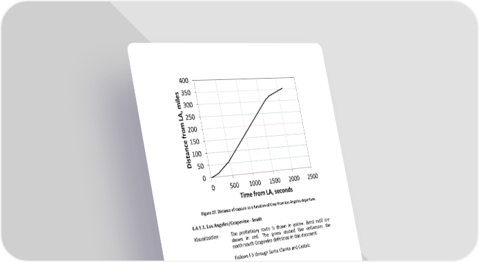 Figure 27. Distance of capsule as a function of time from Los Angeles departure. 4.4.1.1. Los Angeles/Grapevine - South Visualization - The preliminary route is shown in yellow. Bend radii are shown in red. The green dashed line delineates the north/south Grapevine definition in this document. Route - Follows I-5 through Santa Clarita and Castaic.