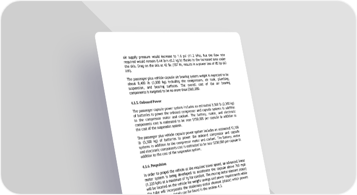 air supply pressure would increase to 1.6 psi (11.2 kPa), but the flow rate required would remain 0.44 lb/s (0.2 kg/s) thanks to the increased area under the skis. Drag on the skis at 42 lbf (187 N), results in a power loss of 85 hp (63 kW). The passenger plus vehicle capsule air bearing system weight is expected to be about 8,400 lb (3,800 kg) including the compressors, air tank, plumbing, suspension, and bearing surfaces. The overall cost of the air bearing components is targeted to be no more than $565,000. 4.1.5. Onboard Power The passenger capsule power system includes an estimated 5,500 lb (2,500 kg) of batteries to power the onboard compressor and capsule systems in addition to the compressor motor and coolant. The battery, motor, and electronic components cost is estimated to be near $150,000 per capsule in addition to the cost of the suspension system. The passenger plus vehicle capsule power system includes an estimated 12,100 lb (5,500 kg) of batteries to power the onboard compressor and capsule systems in addition to the compressor motor and coolant. The battery, motor and electronic components cost is estimated to be near $200,000 per capsule in addition to the cost of the suspension system. 4.1.6. Propulsion In order to propel the vehicle at the required travel speed, an advanced linear motor system is being developed to accelerate the capsule above 760 mph (1,220 kph) at a maximum of 1g for comfort. The moving motor element (rotor) will be located on the vehicle for weight savings and power requirements while the tube will incorporate the stationary motor element (stator) which powers the vehicle. More details can be found in the section 4.3. Hyperloop Passenger Capsule The overall propulsion system weight attached to the capsule is expected to be near 2,900 lb (1,300 kg) including the support and emergency braking system. The overall cost of the system is targeted to be no more than $125,000. This brings the total capsule weight near 33,000 lb (15,000 kg) including passenger and luggage weight. Hyperloop Passenger Plus Vehicle Capsule The overall propulsion system weight attached to the capsule is expected to be near 3,500 lb (1,600 kg) including the support and emergency braking system. The overall cost of the system is targeted to be no more than $150,000. This