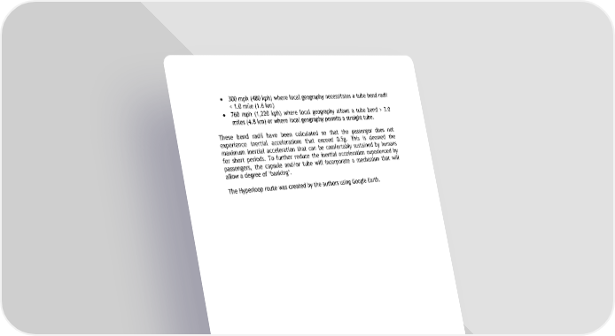 300 mph (480 kph) where local geography necessitates a tube bend radii < 1.0 mile (1.6 km) 760 mph (1,220 kph) where local geography allows a tube bend > 3.0 miles (4.8 km) or where local geography permits a straight tube. These bend radii have been calculated so that the passenger does not experience inertial accelerations that exceed 0.5g. This is deemed the maximum inertial acceleration that can be comfortably sustained by humans for short periods. To further reduce the inertial acceleration experienced by passengers, the capsule and/or tube will incorporate a mechanism that will allow a degree of ‘banking’. The Hyperloop route was created by the authors using Google Earth.