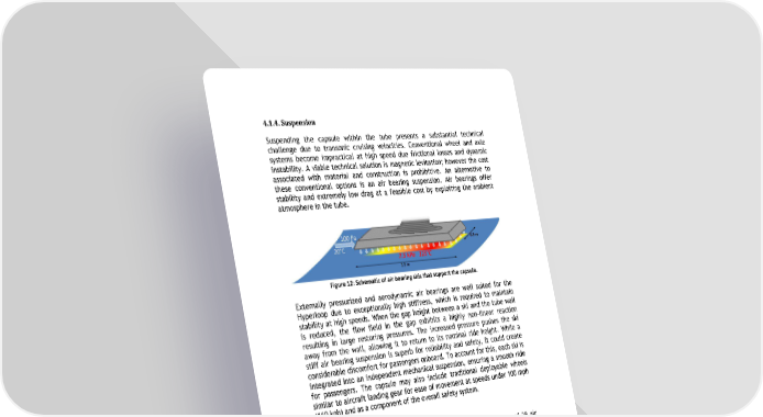 4.1.4. Suspension Suspending the capsule within the tube presents a substantial technical challenge due to transonic cruising velocities. Conventional wheel and axle systems become impractical at high speed due frictional losses and dynamic instability. A viable technical solution is magnetic levitation; however the cost associated with material and construction is prohibitive. An alternative to these conventional options is an air bearing suspension. Air bearings offer stability and extremely low drag at a feasible cost by exploiting the ambient atmosphere in the tube. Figure 12: Schematic of air bearing skis that support the capsule. Externally pressurized and aerodynamic air bearings are well suited for the Hyperloop due to exceptionally high stiffness, which is required to maintain stability at high speeds. When the gap height between a ski and the tube wall is reduced, the flow field in the gap exhibits a highly non-linear reaction resulting in large restoring pressures. The increased pressure pushes the ski away from the wall, allowing it to return to its nominal ride height. While a stiff air bearing suspension is superb for reliability and safety, it could create considerable discomfort for passengers onboard. To account for this, each ski is integrated into an independent mechanical suspension, ensuring a smooth ride for passengers. The capsule may also include traditional deployable wheels similar to aircraft landing gear for ease of movement at speeds under 100 mph (160 kph) and as a component of the overall safety system. Hyperloop Passenger Capsule Hyperloop capsules will float above the tube’s surface on an array of 28 air bearing skis that are geometrically conformed to the tube walls. The skis, each 4.9 ft (1.5 meters) in length and 3.0 ft (0.9 meters) in width, support the weight of the capsule by floating on a pressurized cushion of air 0.020 to 0.050 in. (0.5 to 1.3 mm) off the ground. Peak pressures beneath the skis need only reach 1.4 psi (9.4 kPa) to support the passenger capsule (9% of sea level atmospheric pressure). The skis depend on two mechanisms to pressurize the thin air film: external pressurization and aerodynamics. The aerodynamic method of generating pressure under the air bearings becomes appreciable at moderate to high capsule speeds. As the capsule accelerates up to cruising speed, the front tip of each ski is elevated relative